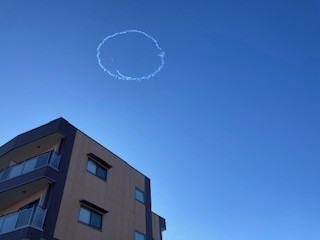 風になびいて完全なにこちゃんではなかったですが、数名の職員と飛行機が描いている様子を生で見ることが出来ました。