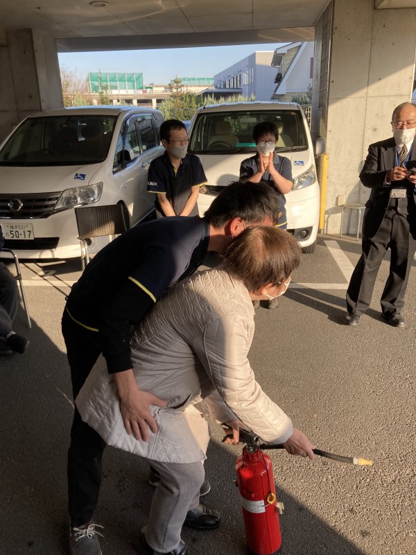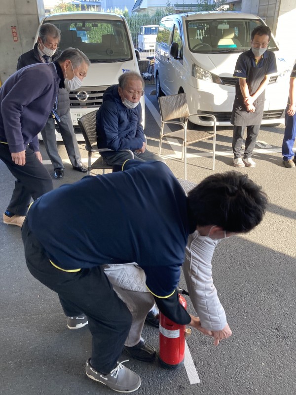 ご利用者様にも消火器を持っていただき、職員と一緒に消化!!