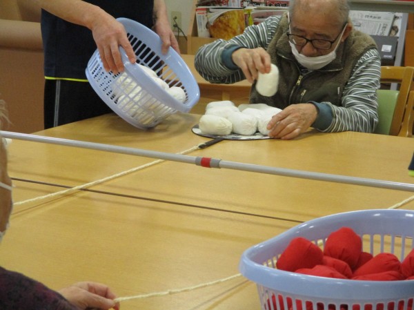 2人1組で片方の方は大きな紐付きの団扇に赤もしくは白のお手玉を積みます。反対側の方は団扇についている紐を引っ張って
