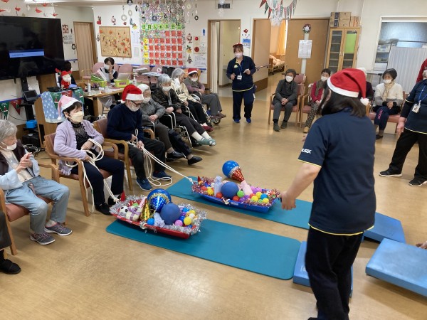 ソリにプレゼントの飾りやカラーボールなどを置き、ご利用者様にロープを引いてもらうゲーム!!ソリの中身が落ちたら、その場からやり直し!!