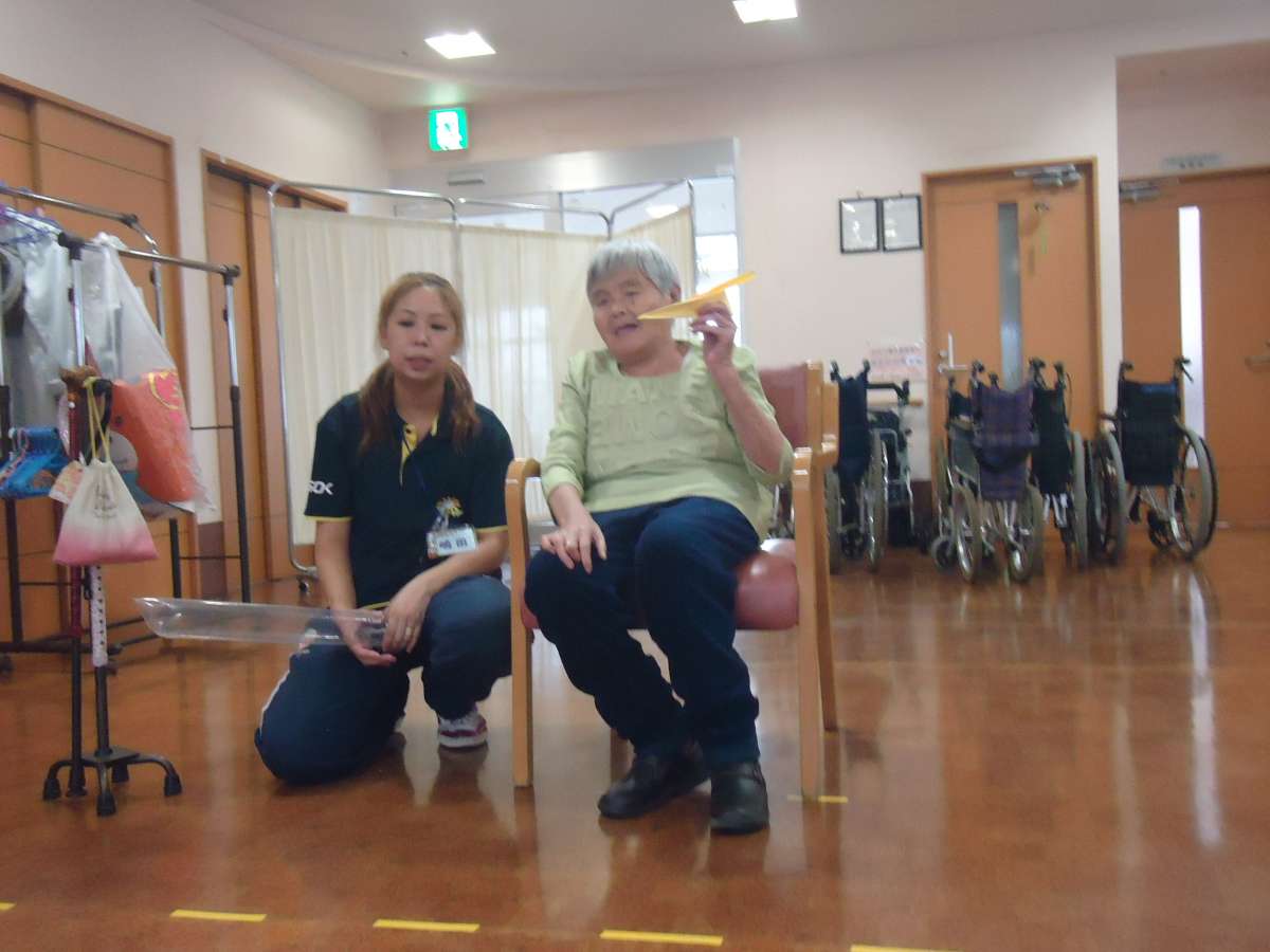 紙飛行機とビニール袋を飛ばすゲームを行いました。