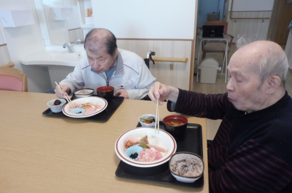 伊達巻、かまぼこ、チキンロール、黒豆などなど沢山ありました。職員の方も盛り付けにこだわって、きれいでした。