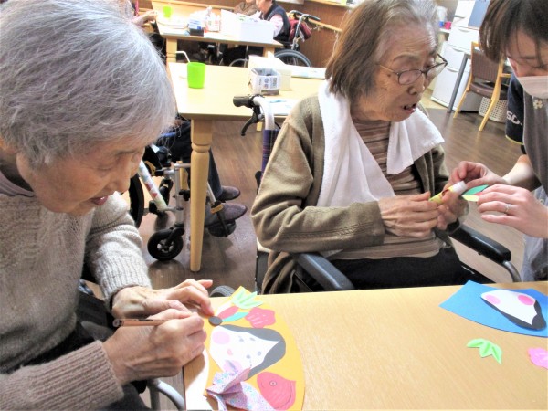 その周りに同じく職員さん達と作った折鶴と鯛と羽根を貼りつけました。