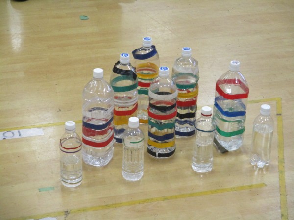 天井に吊るした球を10本あるペットボトルのピンに向けて投げてボーリングのように倒すゲームです(^^)/------O