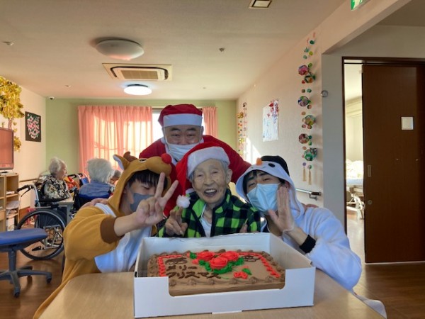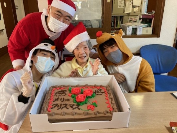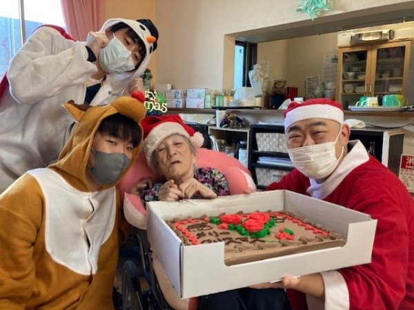 毎年恒例のクリスマス会の大きなケーキを楽しみにされているご利用者様。