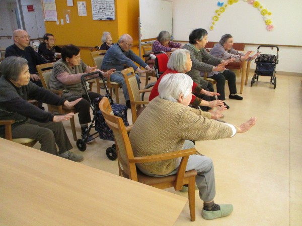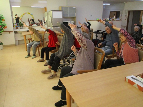 ゆっくりしたリズムで体を動かした後、速いテンポのリズムに乗って体を動かしていただきました。