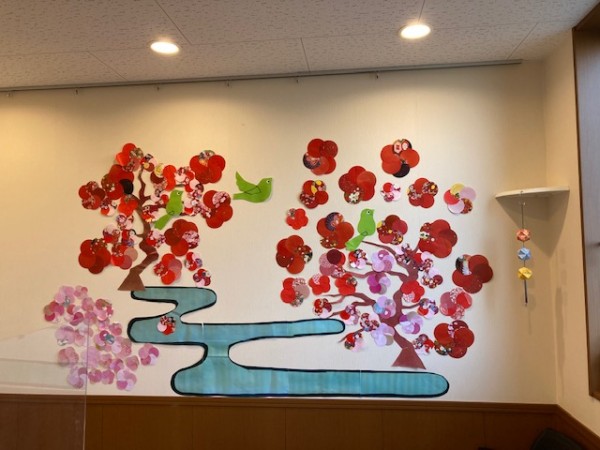 せせらぎでも、出入り口と相談室の壁飾りを新しくし、沢山の梅の花が咲きました。