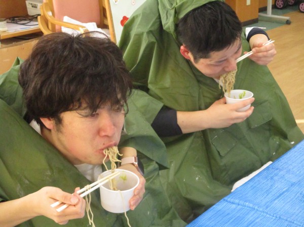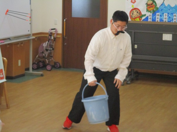 水が入っていると思われるバケツの中が実は紙吹雪と変わっており、ご利用者様めがけて投げた時は驚きと面白さで拍手喝采でした(*^^)v