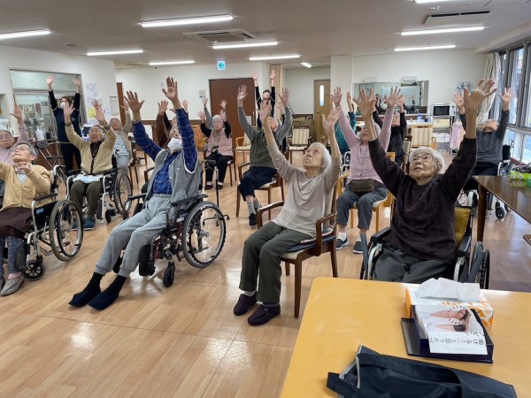 指の体操をされておられます!職員の方も後ろから元気な声がきこえてきます!