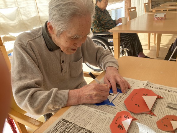顔を書いて豆入れ用のマスをたくさん作りました!!