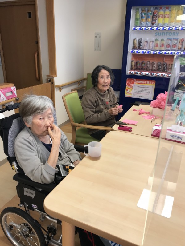 自分のお席でテレビから流れる歌を口ずさみながらお飾り用のお花を作っていらっしゃいました!