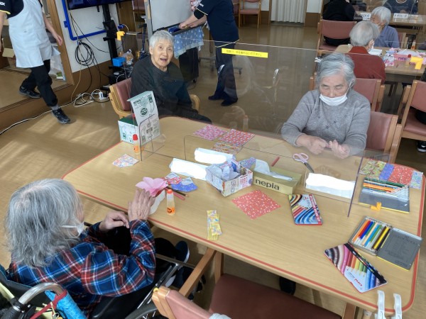 おひな様飾りの工作で、紙を切ったり、塗ったり、くっつけたりしました。