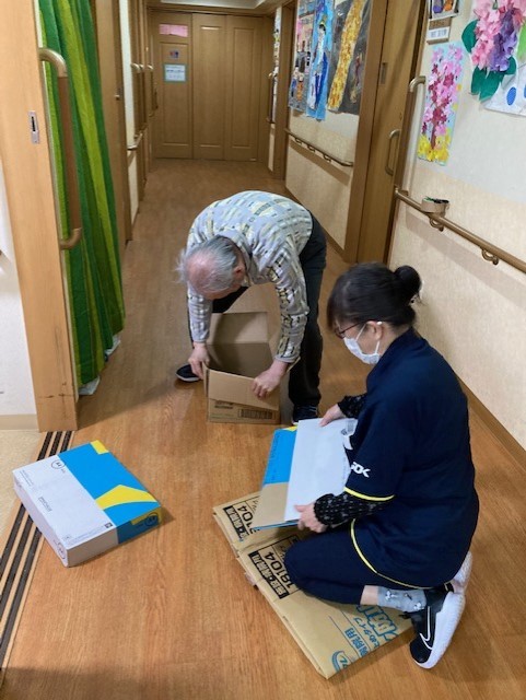 今回はほんの一部ですが、スタッフと協力して段ボールの分解や、入居者様同士協力したりして、