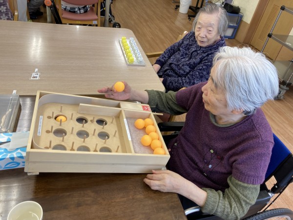 ピンポン玉を穴の中に全部入れる様に頑張っています。
