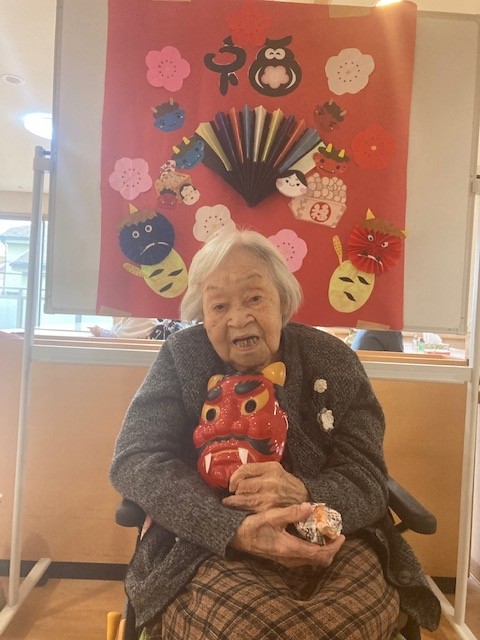 一致団結した結果、鬼退治成功( •̀ ω •́ )✧ 鬼のお面をはぎ取り、満面な笑み[]~( ̄▽ ̄)~* お見事~§(* ̄▽ ̄*)§