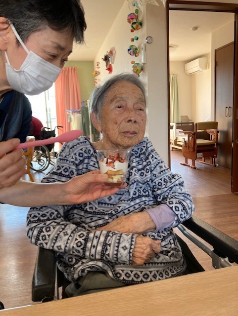 今回はお誕生日の方がいらっしゃらないので「生苺パフェ」を喜んでいるご利用者様の笑顔をご覧ください♪