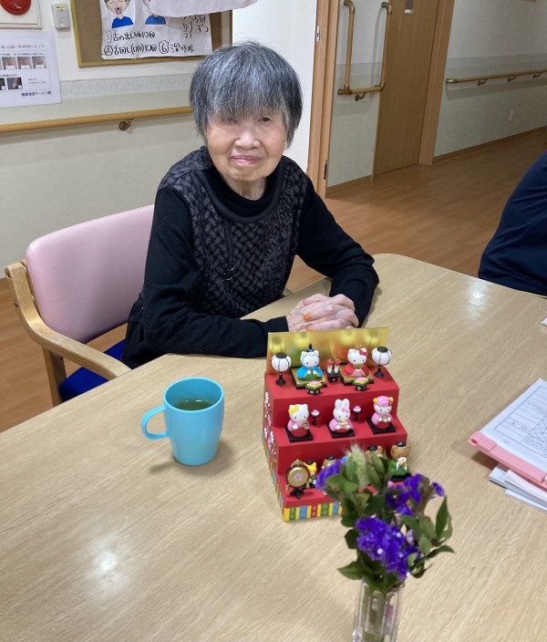 ささやかですが、ひな祭りのお菓子を食べ、小さなひな壇と記念撮影をさせていただきました( *´艸`)