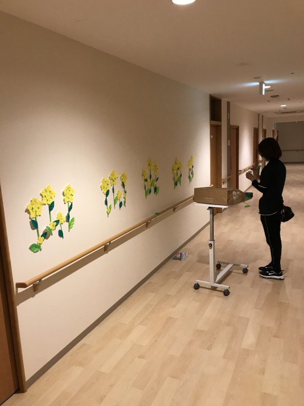 業務終了後に、1F職員が自宅で制作した壁画材料を貼り付けていました
