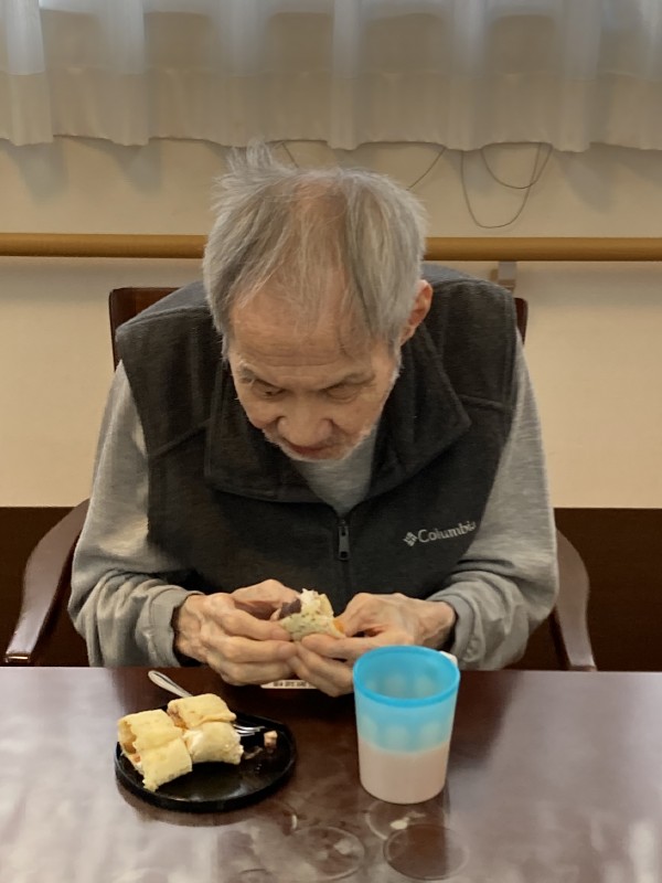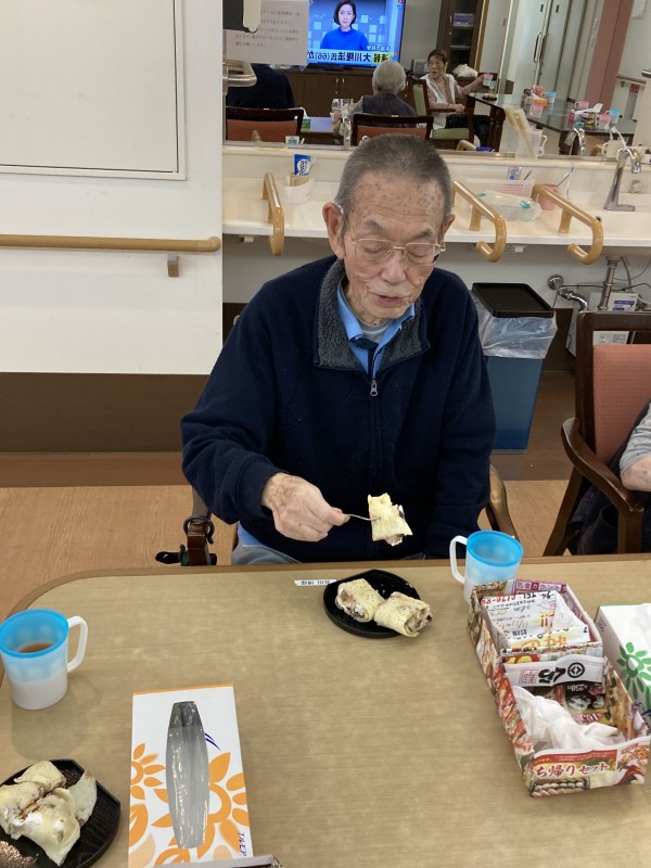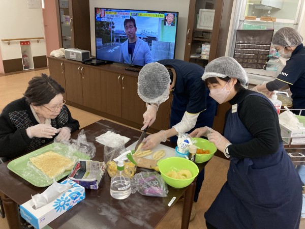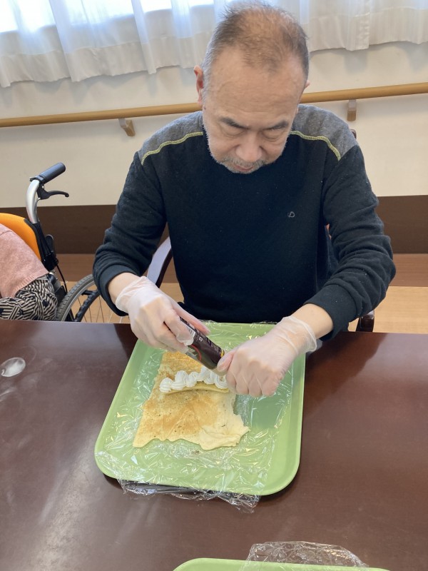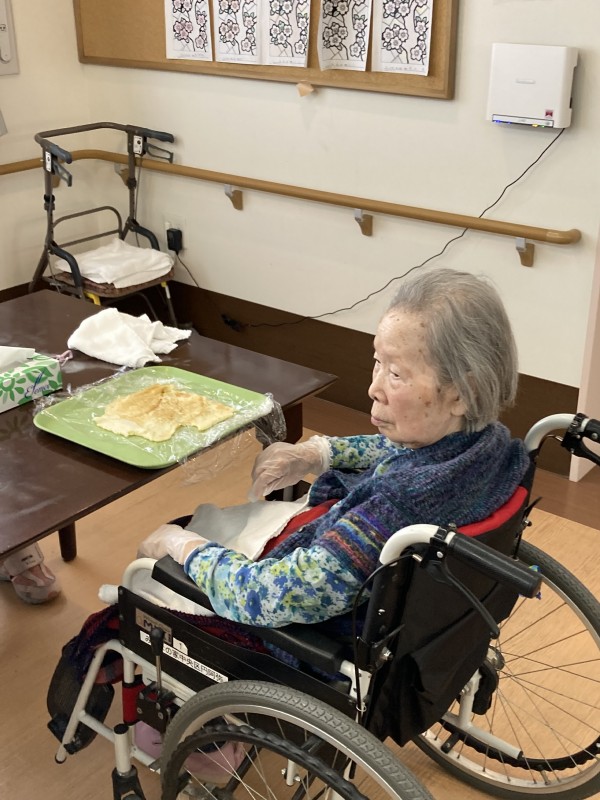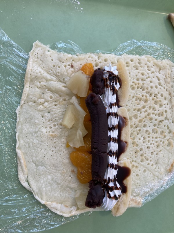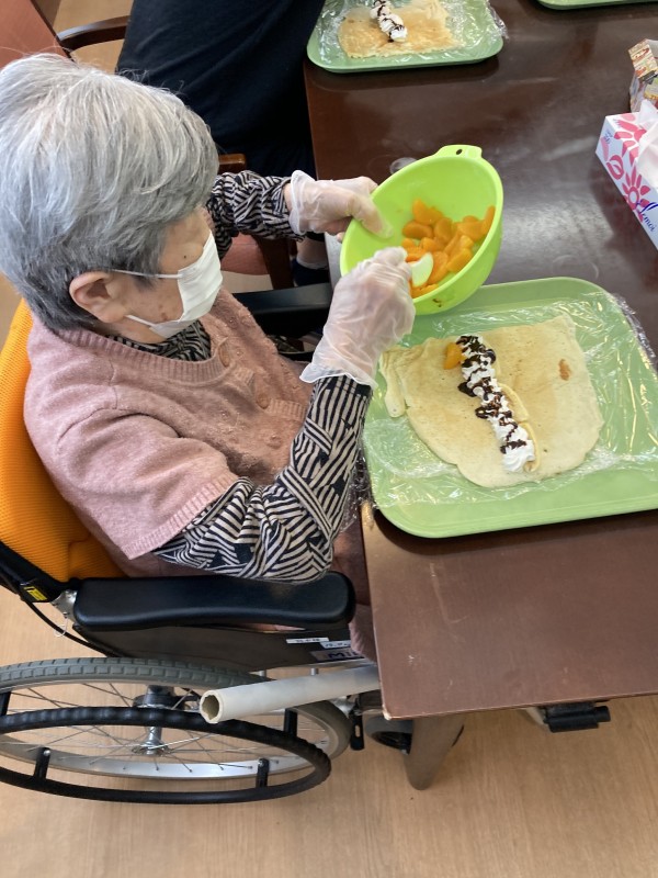 今回はクレープ作りに挑戦しました。ホットケーキの生地を薄くのばし焼いていきます。中身の具材はバナナ・あんこ・ミカン・パイナップル等です。さらに、生クリームやあんこも入りました。