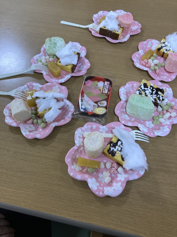 本日のおやつはカステラ、芋羊羹、雛あられ、ふがし、にデコレーションにわたあめをあしらってみました♪