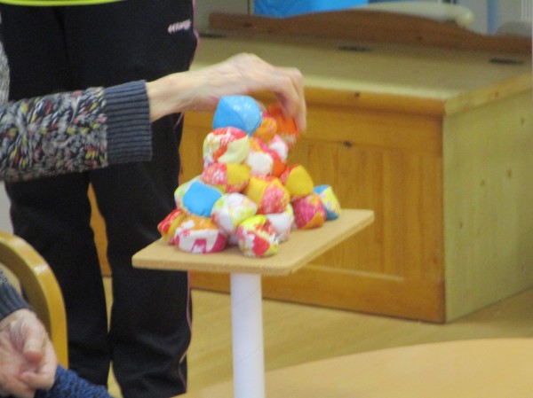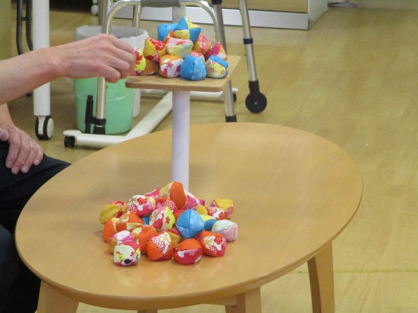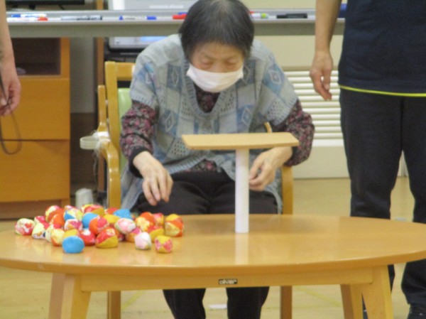 不安定な台の上に最も多くお手玉を並べる事ができた方が優勝です!みんな慎重にがんばれ(^O^)/