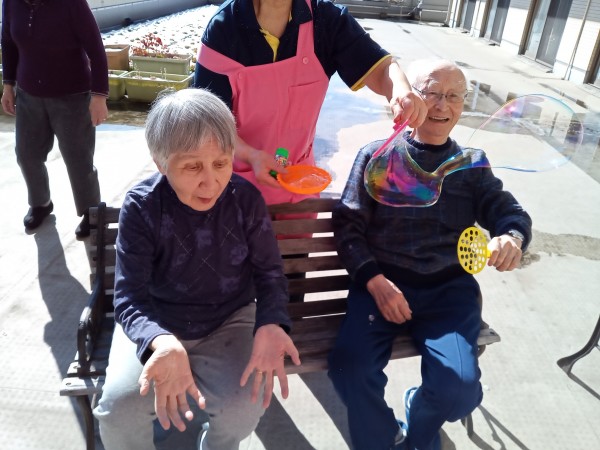 先日、午前のティータイムの後にベランダにてシャボン玉を飛ばしました♪吹くタイプではなく、穴の空いた小さなラケットのようなものを使いました!大きいシャボン玉や一度にたくさんの玉がつくれる形です♪意外と慣れないと使いこなすのが難しく、華麗な手さばきで何度も挑戦される方も居て、きれいな形が作れた時には歓声が上がりましたね♪日光浴も兼ねて、楽しんで頂けたようです♪