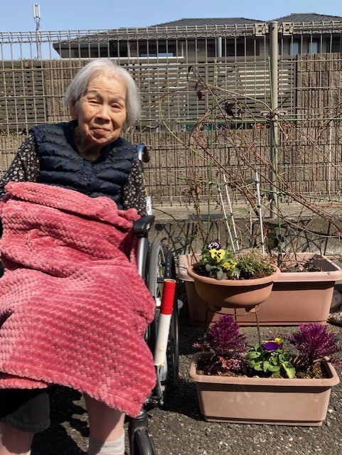 こちらの方も外気浴を満喫されています\( ̄︶ ̄*\)) 「今日は暖かいね。お花も見れて最高だよ」と笑顔で仰っていらっしゃいました。桜が開花しましたら、是非お花見しましょう(* ̄3 ̄)╭