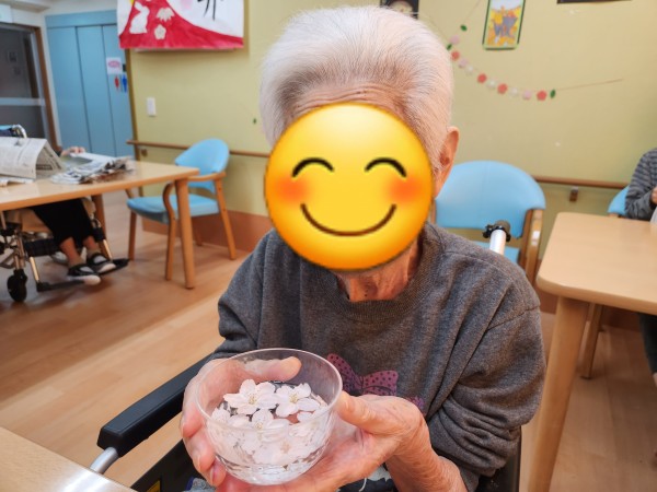 風になびく桜の花びらがちょうど入居者様の頭の上に落ちてきて、髪飾りのようにつけて写真を撮ってみました☆