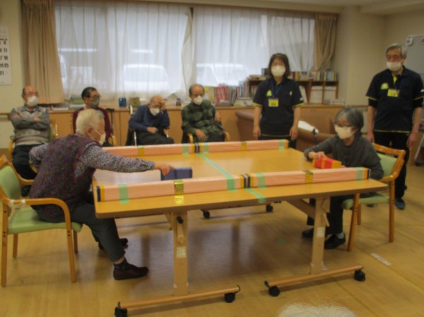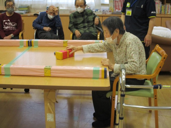 こんにちは!今日の運動レクレーションは『テーブルホッケー』です。
