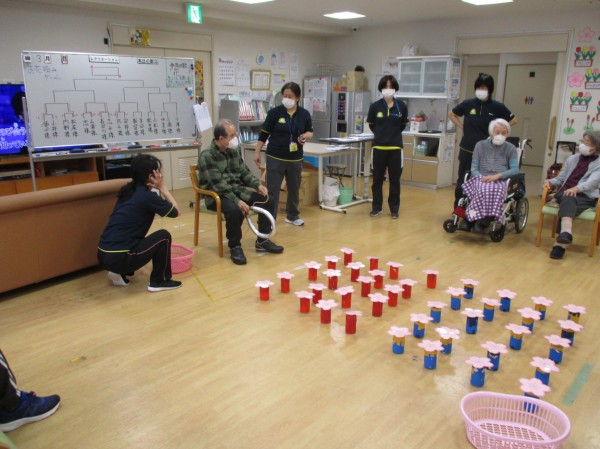 今日の運動レクレーションは『きのこ狩り』です・・・キノコに見立てた造作物に紐の付いた輪っかを投げ