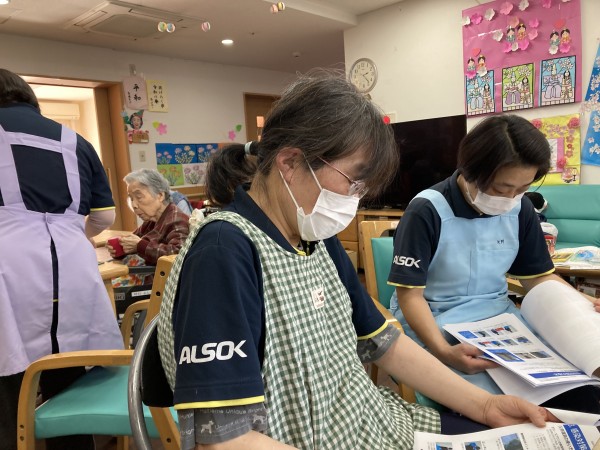 3/27全体会議にて学んだ研修内容を共有しました。毎月全体会議の研修資料作成ご苦労様です。ケアマネHさんの資料は分かりやすいのです!各階にガイドブックを置き、いつでも手に取り確認できます。忘れたときにはすぐ確認していきましょう。