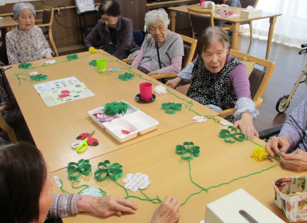 緑の色画用紙を細い短冊にして、クローバーの形に仕上げたり