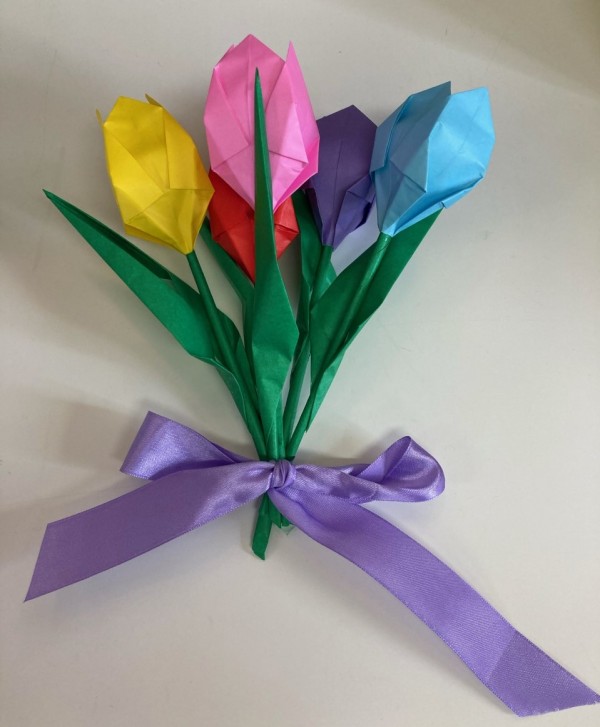 チューリップは様々な色で5本作り、リボンでまとめて花束にしました。