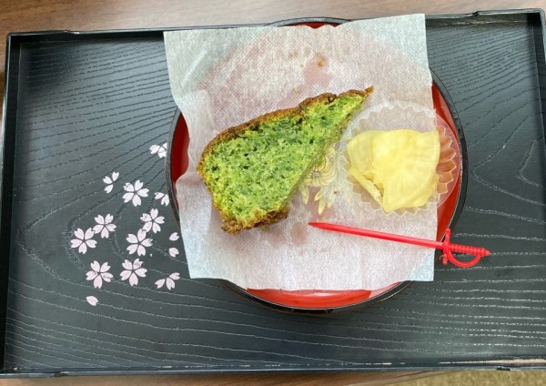 皆さんお待ちかね、制作後のおやつタイムはほうれん草の手作りパウンドケーキとお新香です。