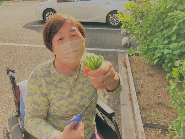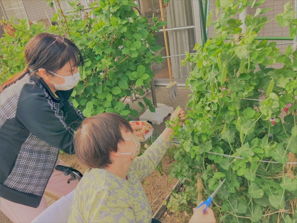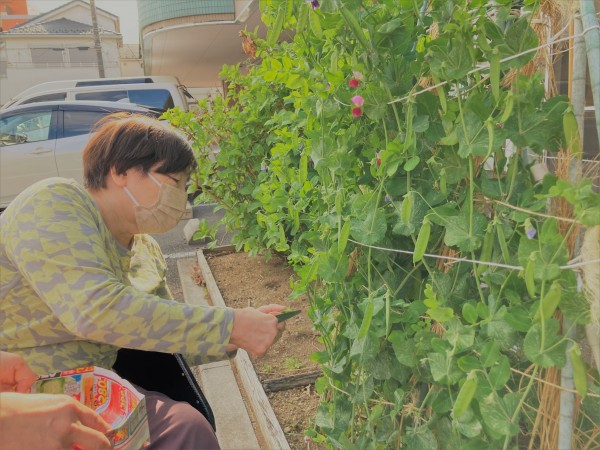 こういう収穫作業が得意なご利用者様とともに、早速サヤエンドウを採っていきます