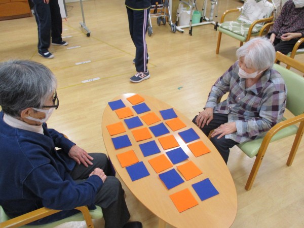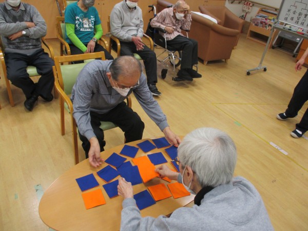 今日の運動レクレーションは『スピード』です。青とオレンジのカード(表⇒オレンジ、裏⇒青)を(掴みやすい素材)2人同時にめくり合い、