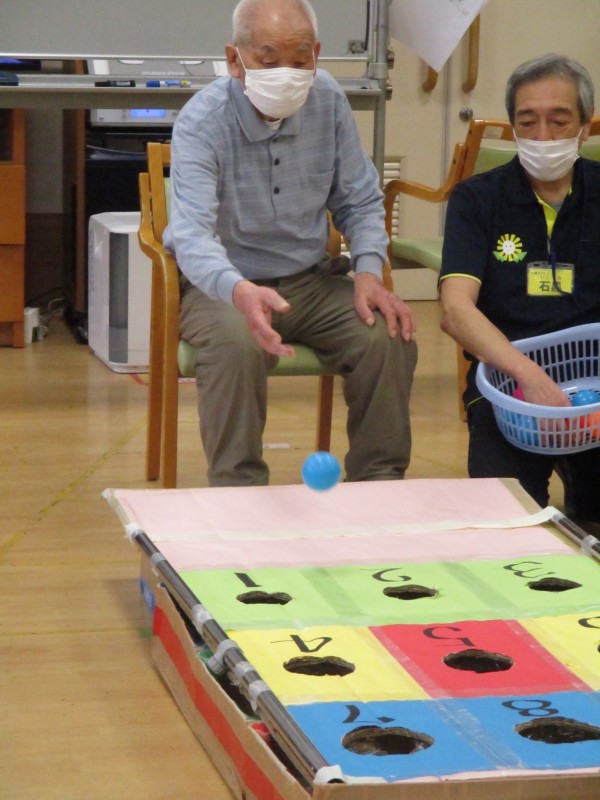 今日の運動レクレーションは『コロコロビンゴ』です!1~9の数字が表示してある穴にボール転がし入った数の合計で競います。