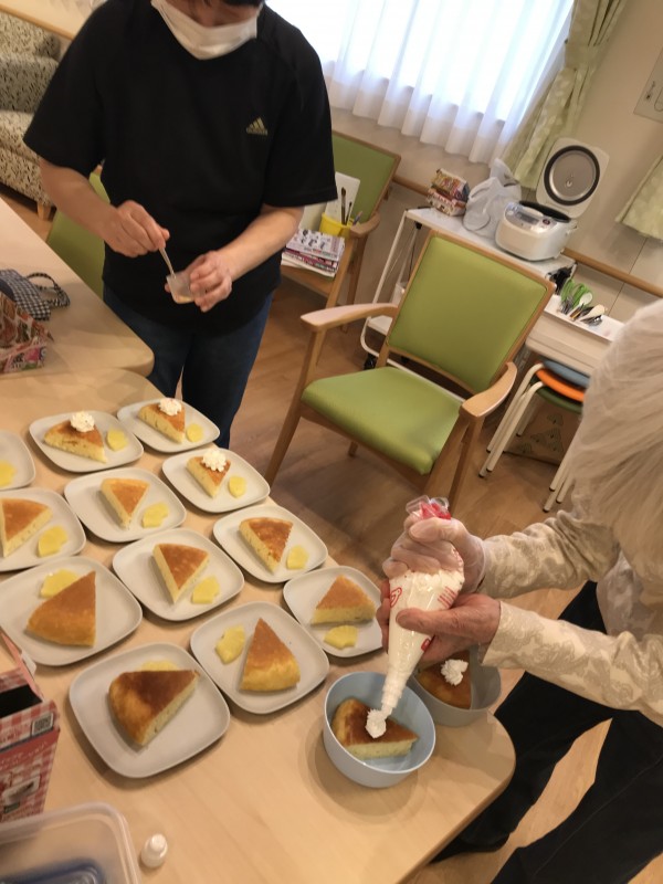 焼いた生地をスタッフと一緒に盛り付けていきます