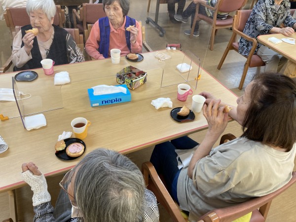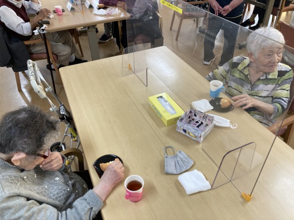 今日のおやつは、旨いもの会でした。あまおう苺ブッセが出ました。