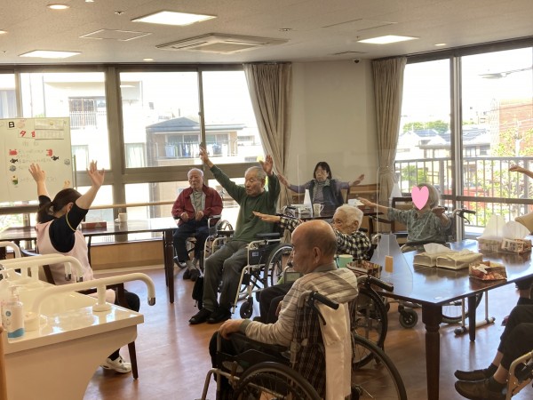 午後のおやつの時間に、ALSOKあんしん体操をはじめとして、各階で元気に体操を行っています。