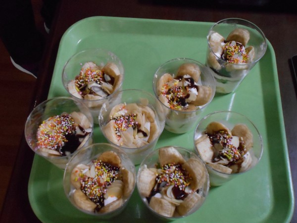 ロールケーキ、生クリーム、キウイ、バナナと交互に器に入れてあとはチョコソース等でデコレーション。