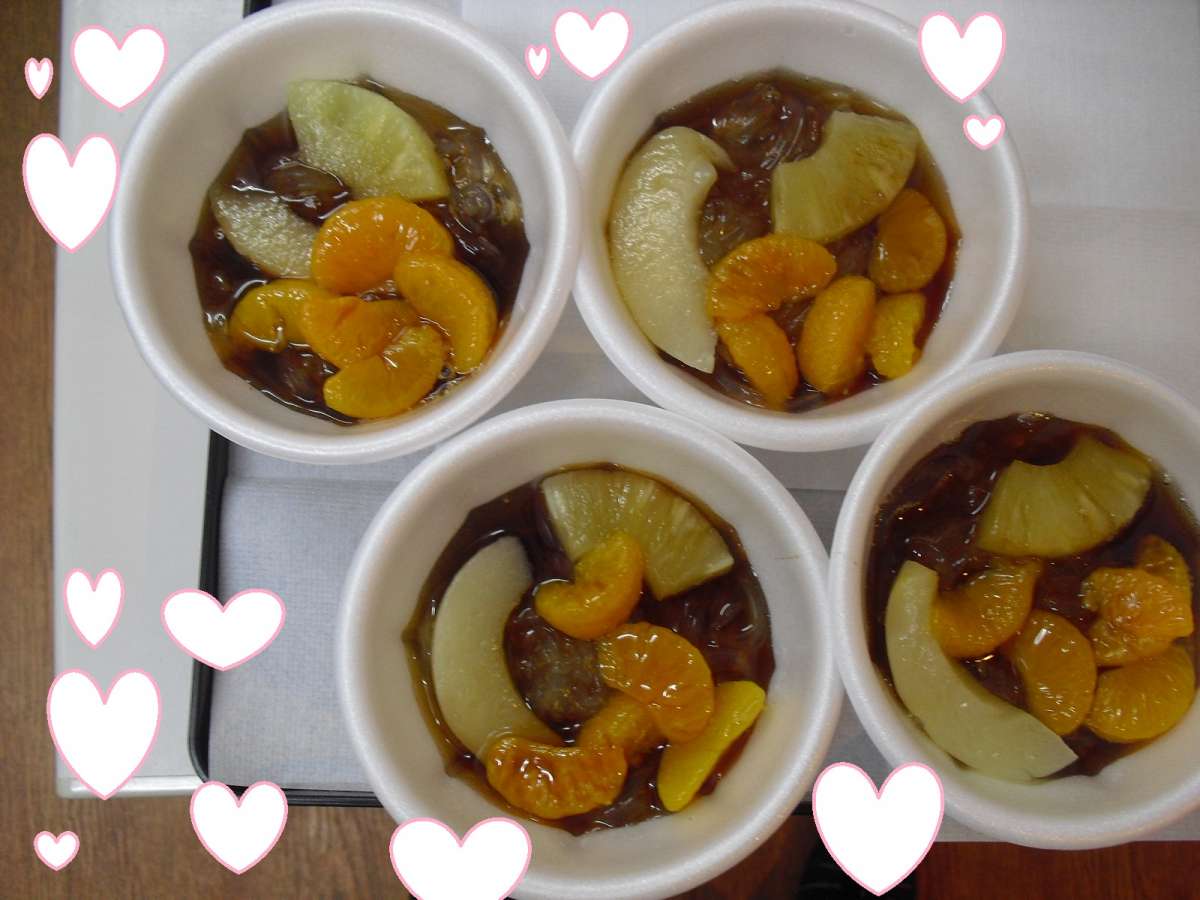 おやつに フレッシュなフルーツをのせた ところてんに甘い黒蜜をかけて、 食べました(^^)