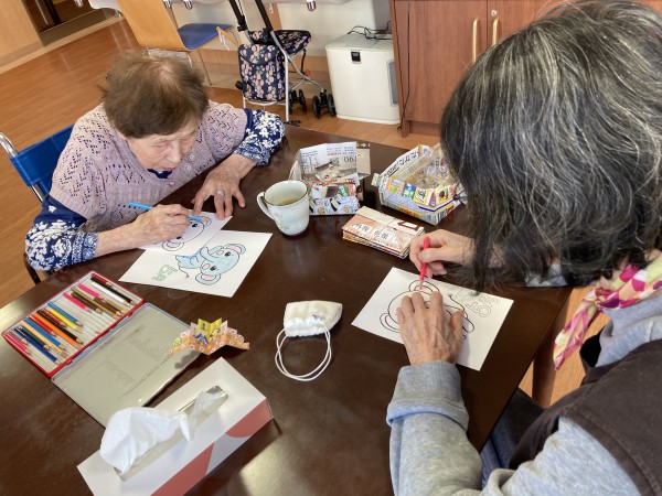 簡単な小象の塗り絵ですが、同じ配色がメインになるので、塗り始める前に悩まれるご利用者様もいました。