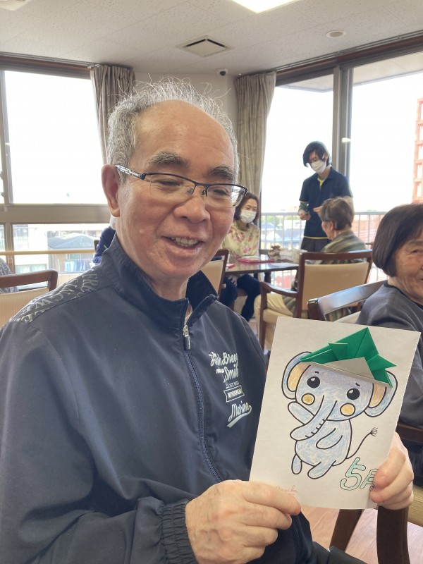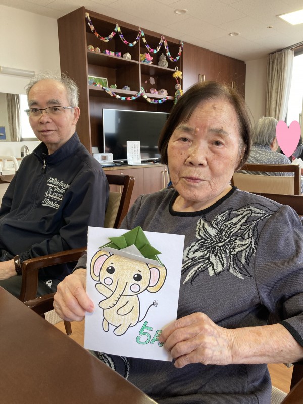 入居したばかりの指先の器用なご利用者様が、かわいい兜を折り紙で折ってくださり、小象の塗り絵にトッピング。