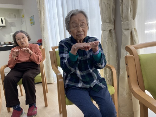 体操の先生を参考にしながら、ご利用者様の皆様が力いっぱい両手を上に伸ばしたり、拳を前にしたり…とてもよく頑張られておられました(^^♪