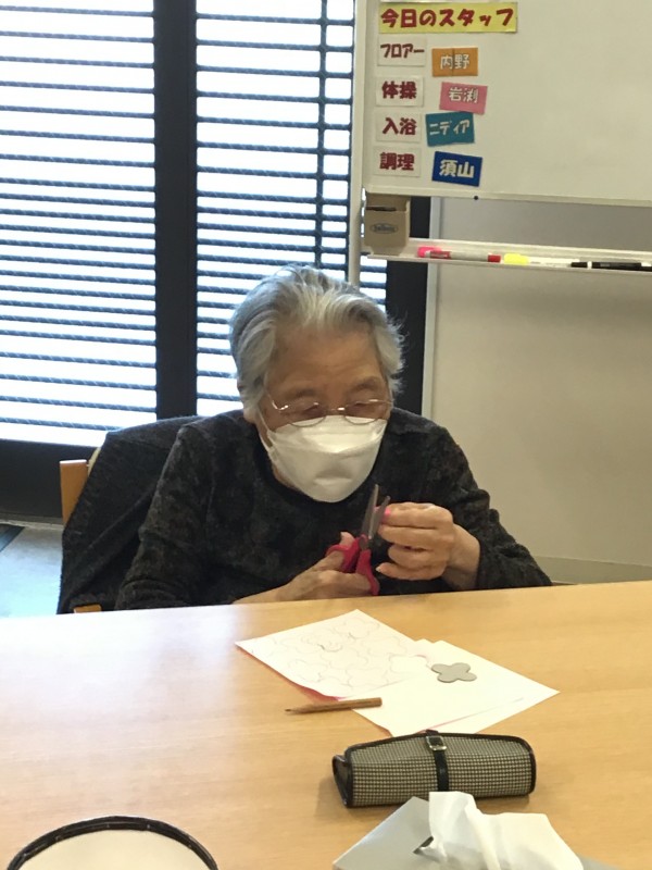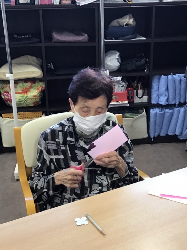 折り紙に花の形を書いたら、ハサミで切って頂きました。