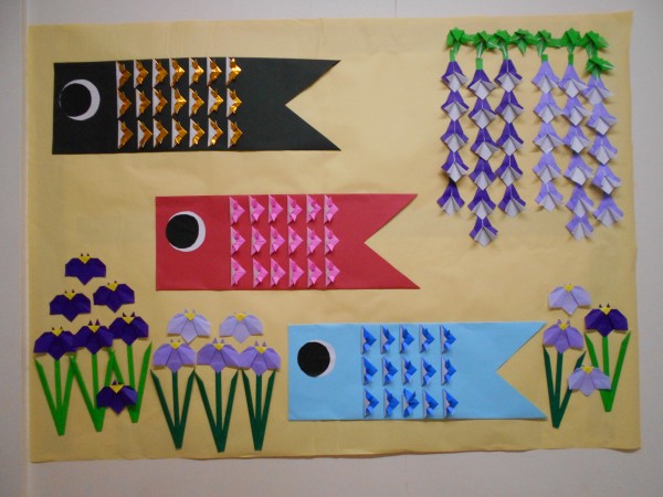 今月の壁画です。鯉のぼりに藤の花、アヤメと季節を感じられますね♪