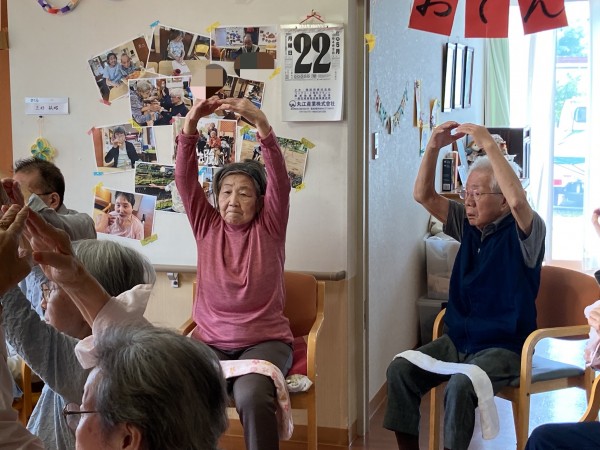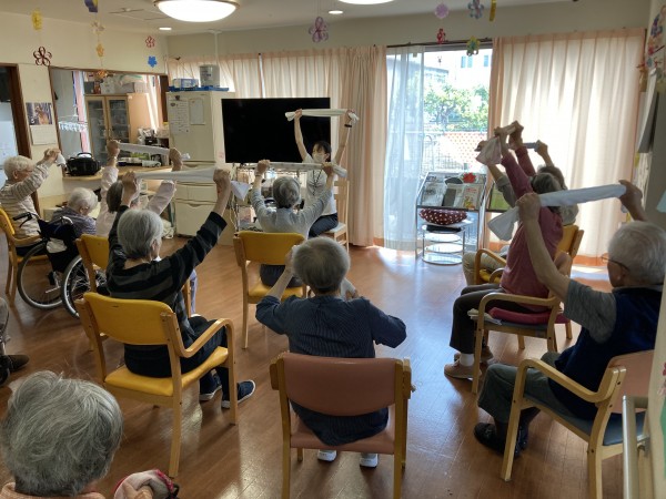 あえて短いタオルのまま体操する利用者様もいらっしゃり…。