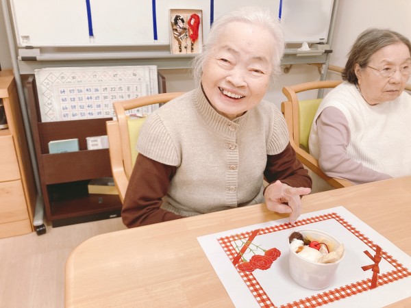 さくらんぼにバナナにアイスが乗ったあんみつ、職員手作りのお手紙とカーネーションをお渡しいたしました。