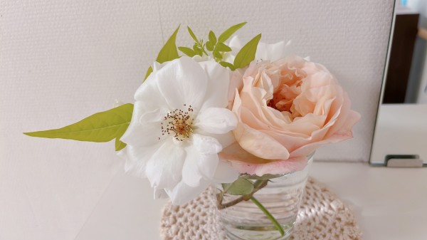 白いバラ、オレンジ色のバラ